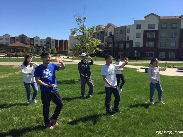 天气晴好的时候,同学们也会相约在公寓旁的草坪上合体锻炼,动作整齐划一,吸引了国际学生驻足欣赏,不少留学生还积极学习、共同参与,加入到练习太极拳的队伍中。