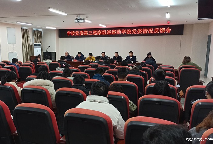 学校党委巡察工作领导小组成员、校党委巡察办主任王海林、第三巡察组副组长赵伟及有关同志、校纪委办案管审理室主任李晓松、药学院党委领导班子成员参加会议,药学院党委学院内设机构主要负责人、党支部支委会成员、高级职称人员、学生代表等60余人列席会议。
