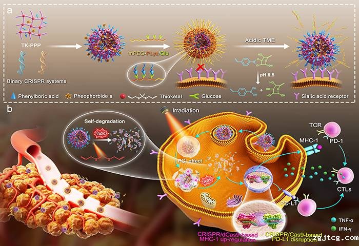 针对规律间隔成簇短回文重复序列(CRISPR)基因编辑系统在正常生理环境中的不可控激活,该研究设计了一种可以限制 CRISPR系统在肿瘤部位特异性激活的pH-光双响应CRISPR纳米药物(DBCN)。DBCN由缩酮交联的内核和肿瘤微环境响应性聚乙二醇(PEG)外壳组成,使得DBCN能够避免血液循环阶段被清除并响应于酸性肿瘤微环境在肿瘤组织中富集,最终在激光照射下特异性激活被肿瘤细胞摄取的CRISPR系统,从而最大限度地提高治疗效果并降低潜在的安全隐患。