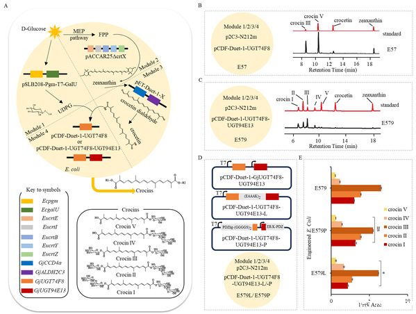 进一步将筛选得到的高效突变体N212m以及其余10个西红花苷生物合成通路基因构建至大肠杆菌底盘细胞,结合体内自组装酶反应技术及工程菌株培养发酵条件优化等研究,实现由葡萄糖至五种类型西红花苷的从头合成,生产出的西红花苷最大产量在摇瓶水平超过每升10毫克。本研究涉及的西红花苷生物合成大肠杆菌工程菌株保藏于中国普通微生物菌种保藏管理中心(CGMCC),并已申请相关发明专利。该研究基于大肠杆菌底盘,首次实现廉价葡萄糖至五种珍稀西红花苷资源的生物合成,为西红花苷合成生物学高效生产研究提供重要参考。