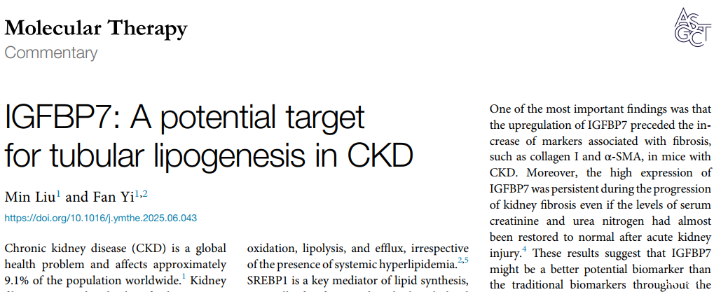 近日,我院肾脏病研究团队在国际知名期刊Molecular Therapy上发表了题为 “Renal tubular epithelial IGFBP7 interacts with PKM2 to drive renal lipid accumulation and fibrosis”的研究论文。该研究首次系统揭示了肾脏损伤标志物胰岛素样生长因子结合蛋白7(IGFBP7)在慢性肾脏纤维化中的核心作用及其分子机制,并发现哮喘药物沙美特罗具有潜在的抗肾脏纤维化作用。