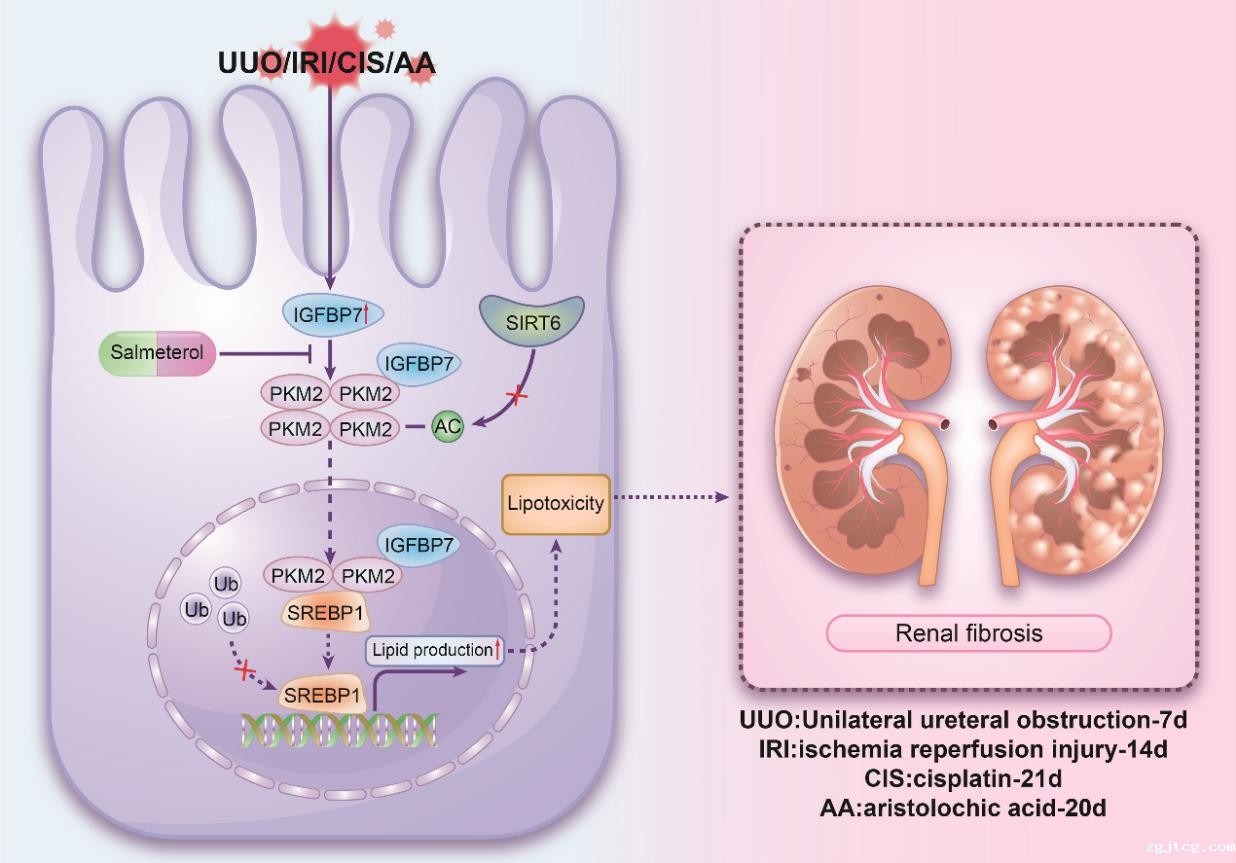 机制研究表明,肾小管上皮细胞中的IGFBP7通过直接靶向结合代谢关键酶丙酮酸激酶M2(PKM2),促进其K433位点乙酰化,从而增强PKM2的核转位。入核的PKM2进而激活脂质合成核心转录因子SREBP1,导致肾脏脂质异常积累,最终驱动纤维化进程。