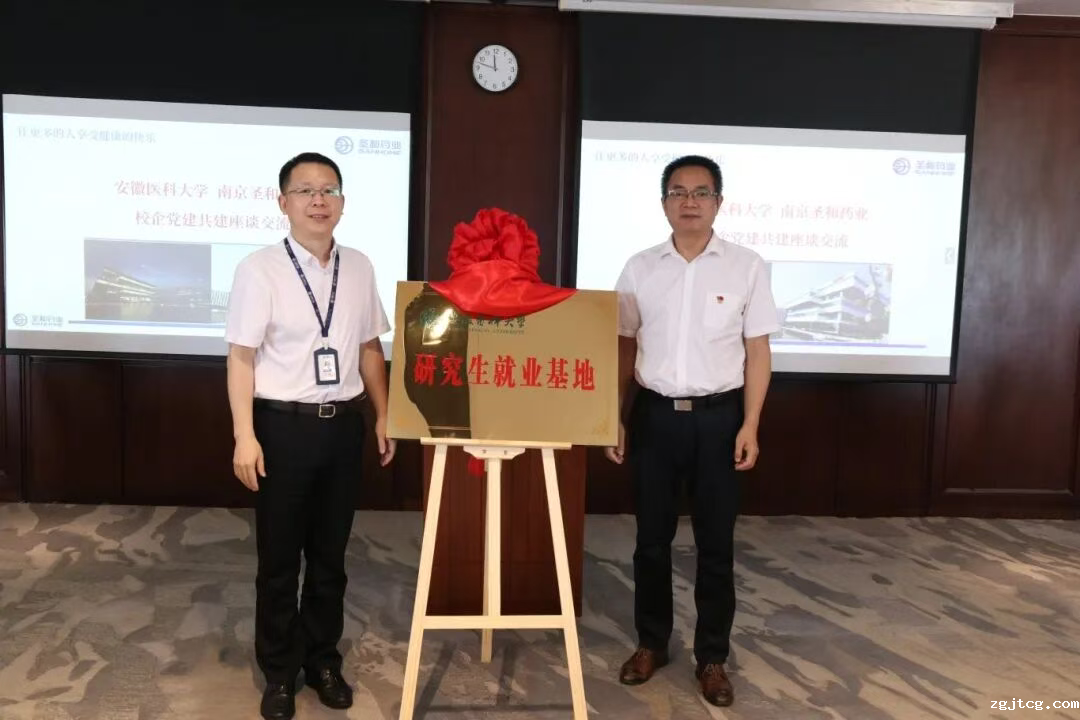 南京圣和药业副总经理张小猛主持座谈会,双方就“校企合作模式创新”“就业指导与人才联合培养路径”“党支部共建”等主题深入研讨,达成多项合作共识。会后,双方共同举行“新利体育在线娱乐南京圣和研究生就业基地”揭牌仪式。