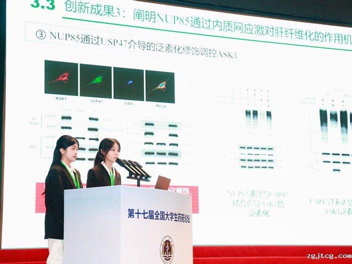 据了解,本届论坛共吸引来自北京大学、复旦大学、浙江大学、中国药科大学等126所高校的279项作品同台竞技,参赛规模与质量均创下历史新高。经过激烈角逐,由我院徐涛教授指导,2023级本科生占晔负责、华晗涵参与的《NUP85通过USP47/ASK1信号通路介导内质网应激调控肝纤维化进程》包揽本届赛事“创新成果一等奖”“优秀论文奖”和“优秀壁报奖”。