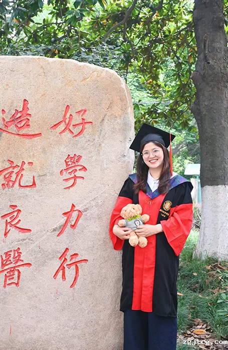 2025年毕业典礼结束后,一位身着博士红袍的女生笑靥如花,拿着心爱的小熊玩偶在校训石旁留下一张青春的倩影。她就是安徽省2025年优秀毕业研究生,来自luck18官方公告的2025届博士毕业生陈婷婷。